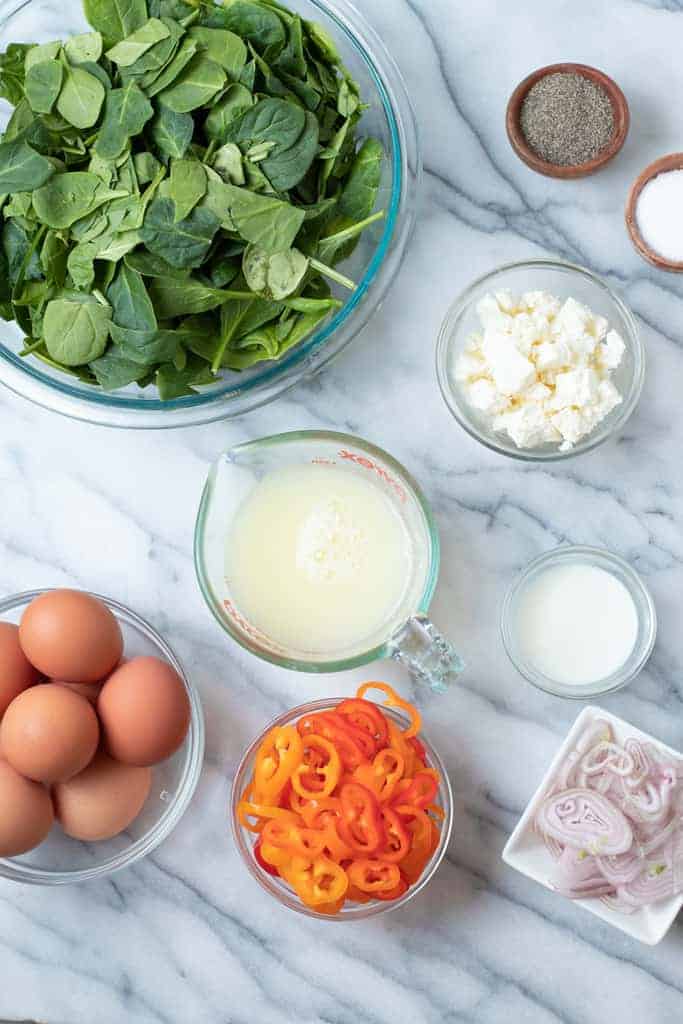 This delicious spinach frittata is made with simple, good-for-you ingredients that will keep you fueled right up until lunch. Here’s what you’ll need: