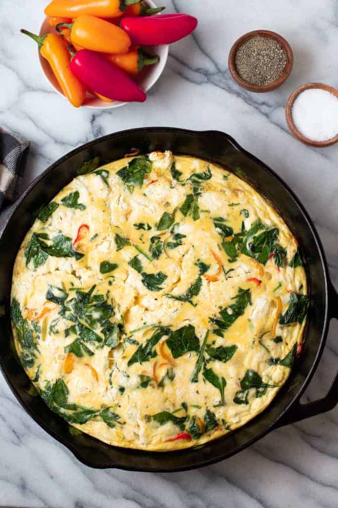 You can never go wrong with a tasty egg bake to start off your day, and this frittata recipe made with spinach, baby bell peppers, and feta cheese is one of my favorites (it may be tied with my roasted vegetable frittata)! It’s quick to put together, flavorful, and can satisfy even the heartiest of appetites.