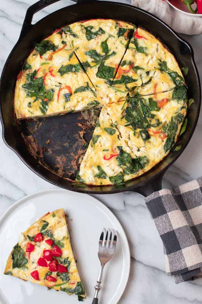 This spinach frittata is a quick and easy way to eat a nutritious meal for breakfast, lunch, or dinner. Featuring spinach, baby bell peppers, and creamy feta cheese, it’s super flavorful and can be ready with very little effort or meal prepped ahead of time. Serve it warm or cold, paired with a green salad or fresh fruit and enjoy.