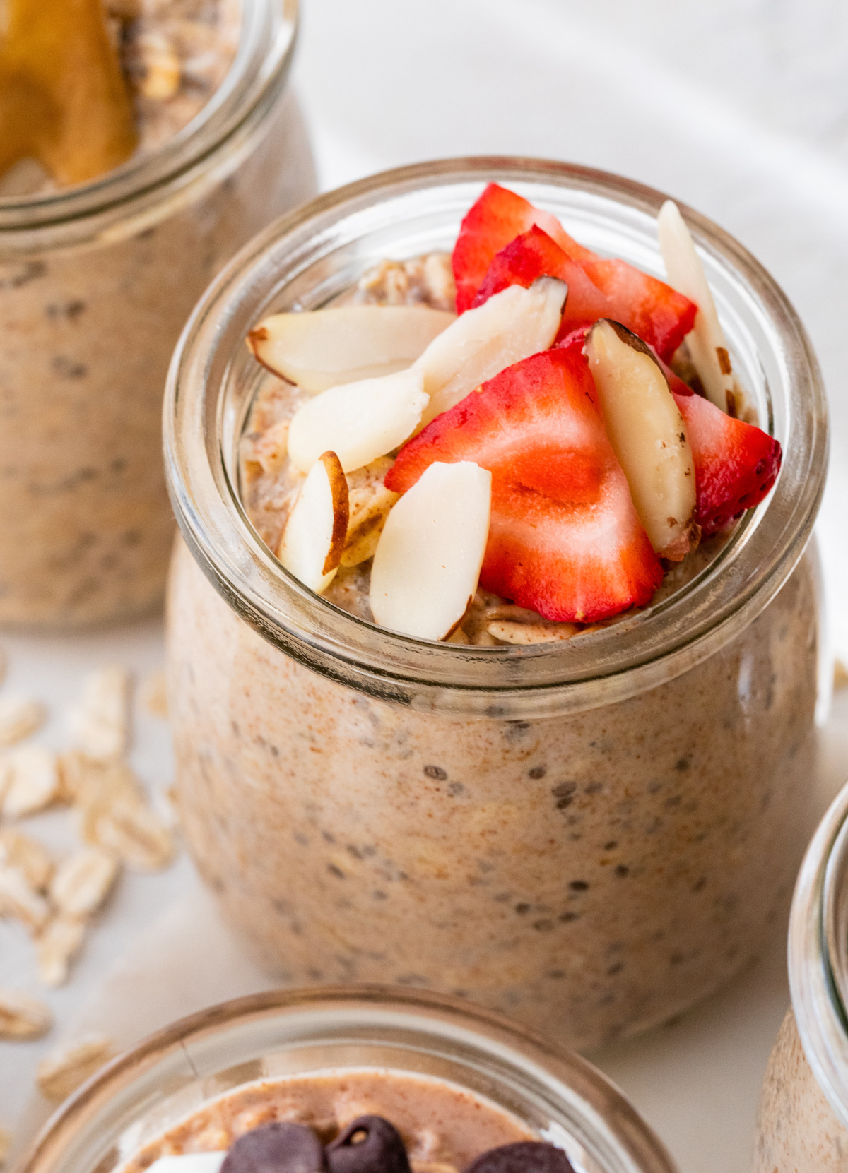 - Strawberry Almond: Mix one tablespoon of almond butter into the oats before refrigerating. Top with chopped strawberries and sliced almonds.