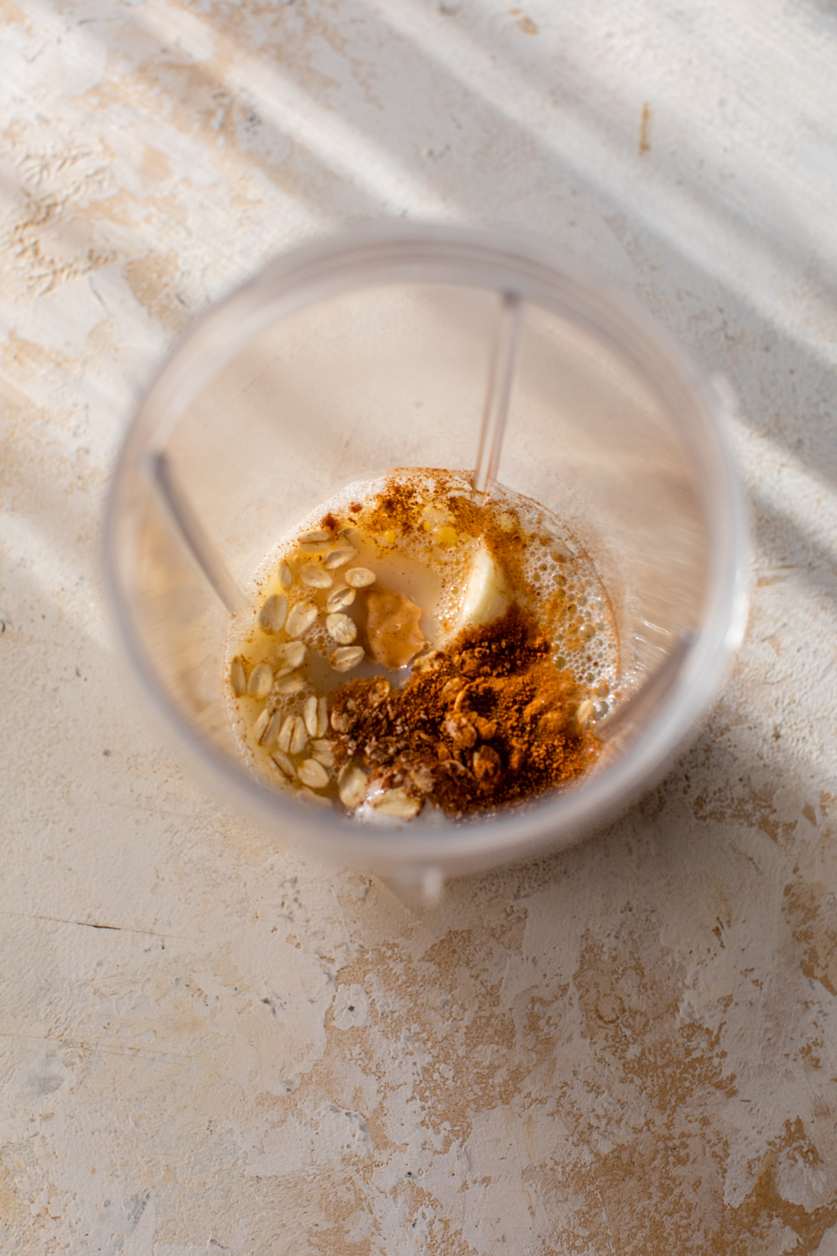 - Blend ingredients – Combine oats, baking powder, egg whites, peanut butter, 1/4 banana, and cinnamon in a blender and blend until you have a thick but pourable batter. You may have to blend, then scrape the sides, and blend again.