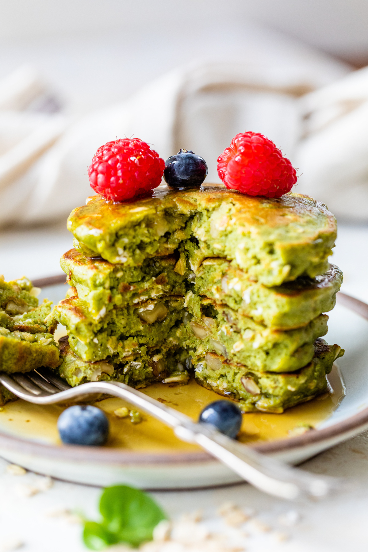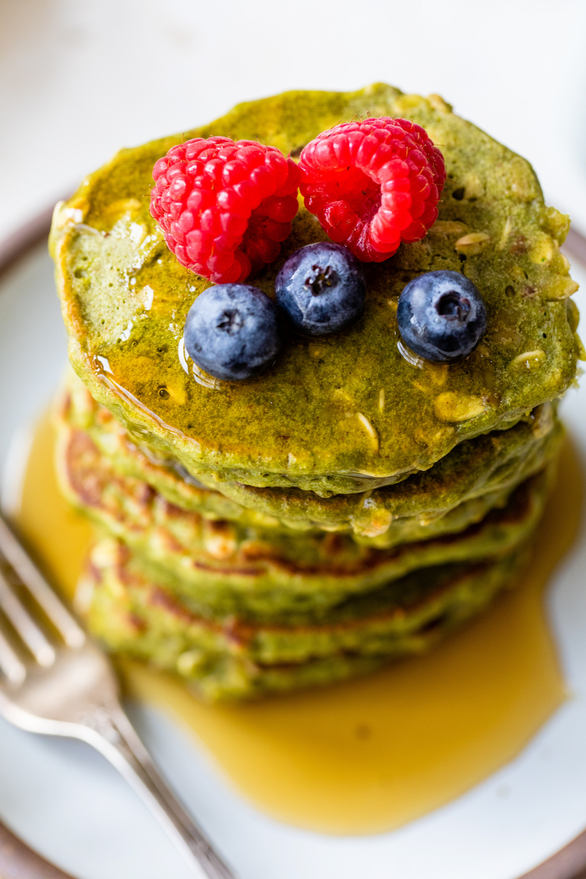 Pro-Tip: Instead of using 1 cup of fresh baby spinach in these pancakes, you can sub in 1/3-1/2 cup of frozen spinach that has been defrosted. Just be sure to squeeze out as much water as you can before adding the spinach to your blender.