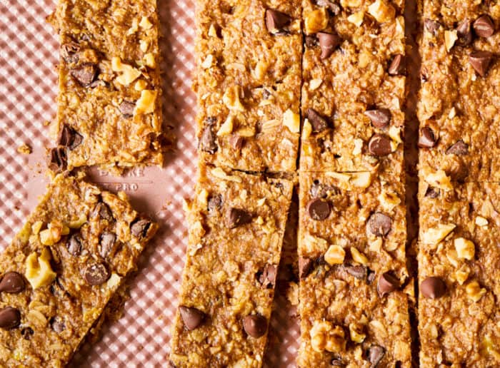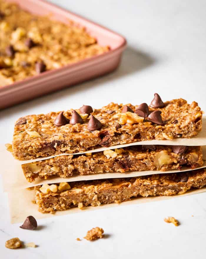 Just wanted to add myself to the list of huge fans of this recipe! I’ve been making these regularly since May and LOVE them. I make minor tweaks – my son is allergic to tree nuts so I always use seeds instead (usually a mix of raw/shelled pumpkin + flax seeds). I don’t have a big sweet tooth so I use just-ripe bananas and very dark chocolate (72-85%; I chop up a bar into small pieces). I use a regular 9×13 pan lined with parchment since I don’t have a quarter sheet pan and it works fine. I can’t say enough about these bars. I look forward to having one each day with my mid-morning coffee. Thank you for sharing it! LOVE!
