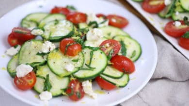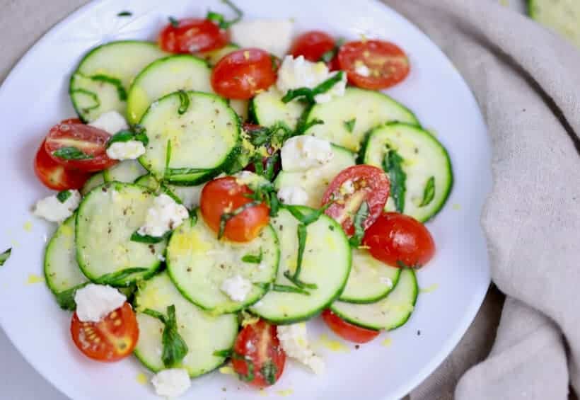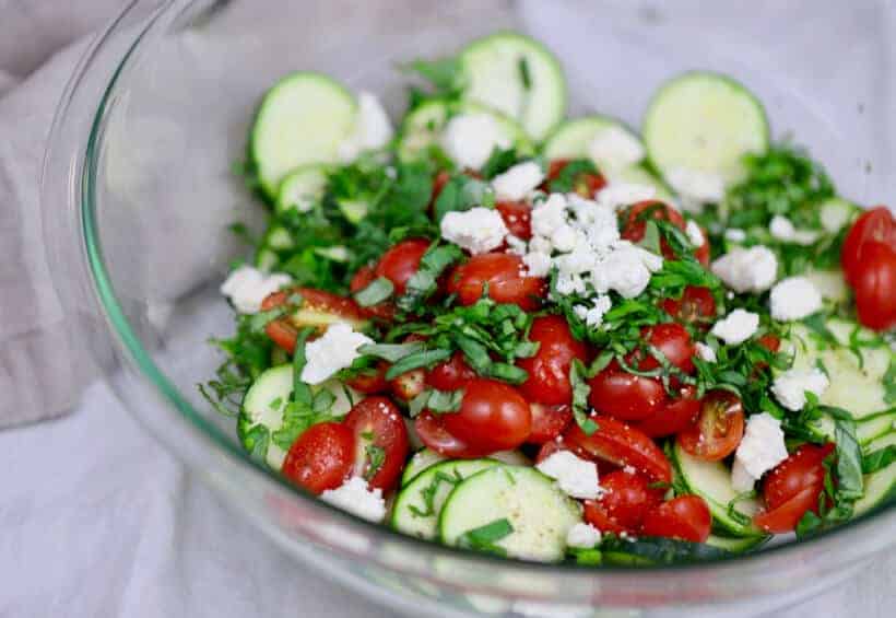 This raw zucchini salad with tomatoes and feta cheese is the perfect way to get fresh, seasonal ingredients onto your plate. I love finishing this salad with fresh basil and lemon zest, to create flavors that explode in your mouth.